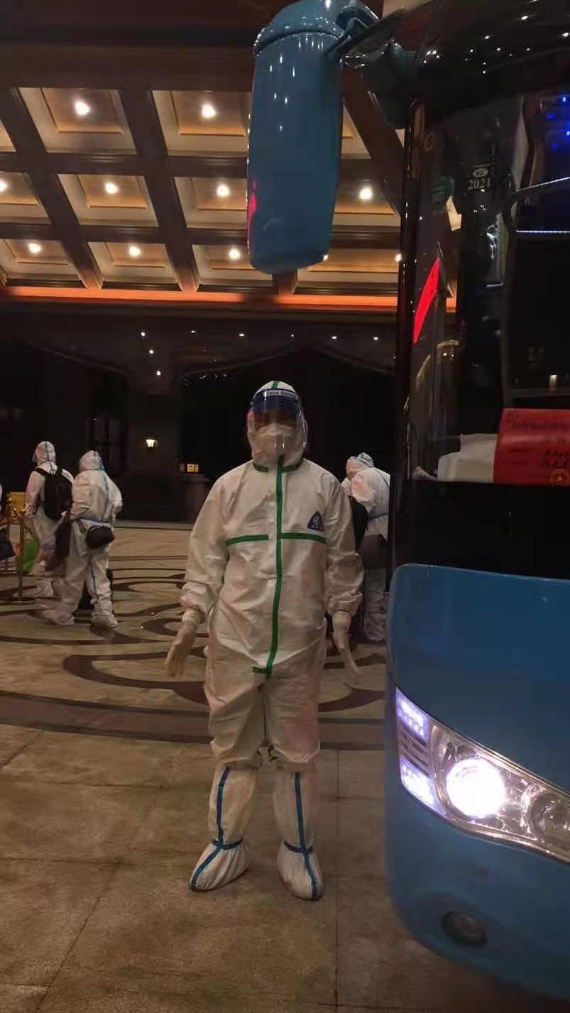 由于南京的疫情有所好轉(zhuǎn),家鄉(xiāng)揚(yáng)州的疫情又突發(fā),7月31日接到通知返回?fù)P州繼續(xù)“作戰(zhàn)”。回到揚(yáng)州后到疾控中心做完核酸檢測(cè)一切正常,并前往酒店進(jìn)行隔離,準(zhǔn)備全身心投入后續(xù)轉(zhuǎn)運(yùn)工作。每當(dāng)執(zhí)行轉(zhuǎn)運(yùn)任務(wù)時(shí),穿著防護(hù)服、戴著護(hù)目鏡開車,對(duì)有豐富駕駛經(jīng)驗(yàn)的他來說,仍是一個(gè)不小的挑戰(zhàn),全身被包裹得密不透氣,行動(dòng)十分不方便,必須高度集中精神,小心駕駛確保行車安全。談及轉(zhuǎn)運(yùn)工作,魏建也記不清轉(zhuǎn)運(yùn)了多少趟隔離人員了,反正每趟任務(wù)都安全保質(zhì)保量的完成了。