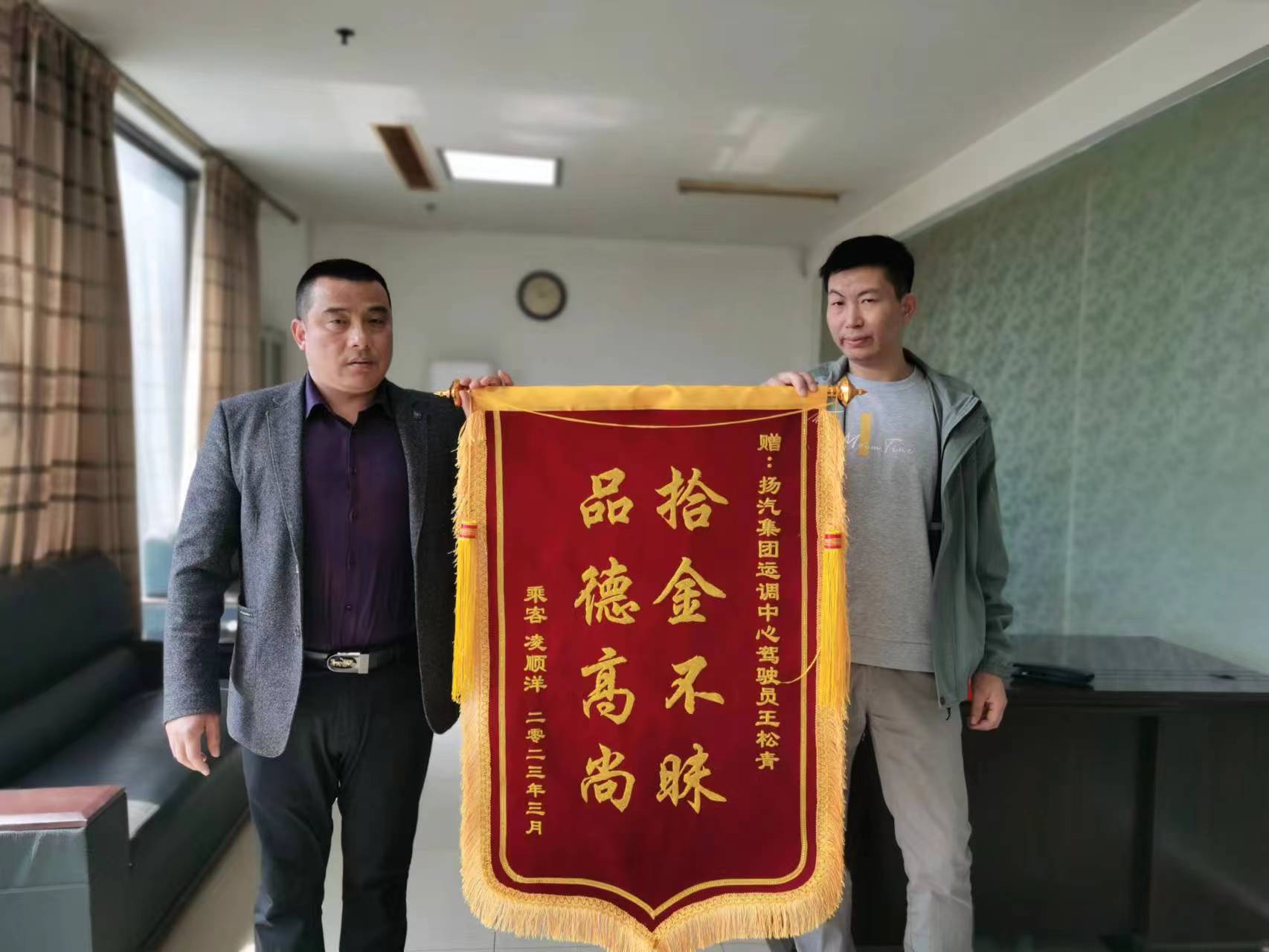 3月31日上午,市民凌先生來到江都汽車站,將一面印有“拾金不昧,品德高尚”的錦旗交到了分公司相關負責人的手上,以此來表達對駕駛員王松青師傅拾金不昧行為的感謝。